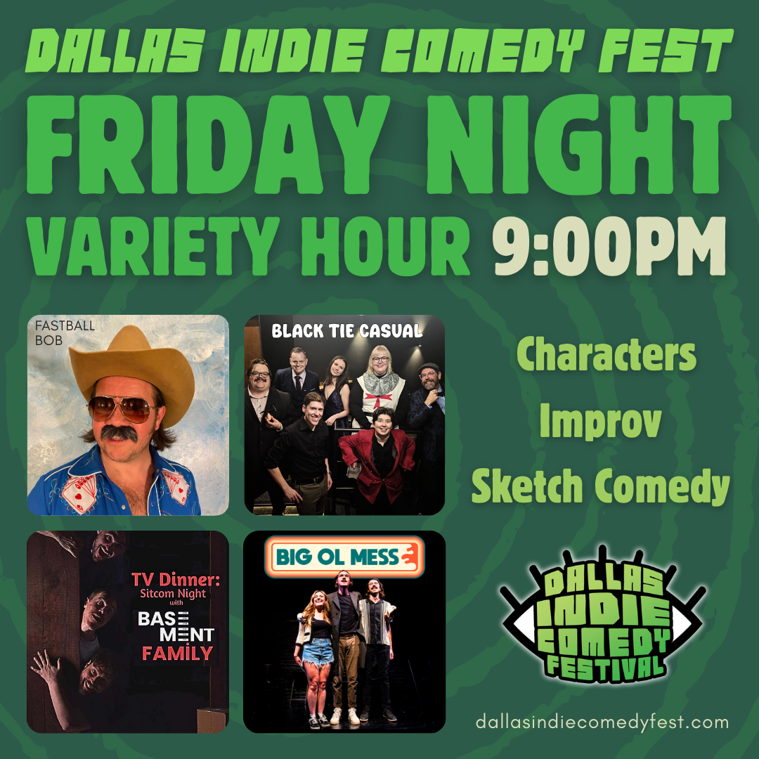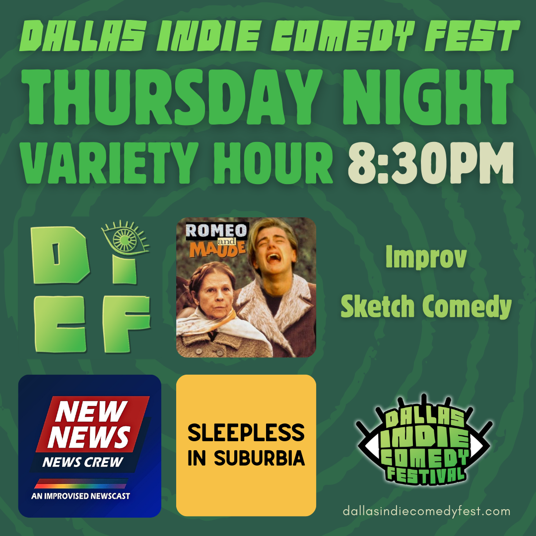 Opening Night of Dallas Indie Comedy Fest ends with a bang with the DICF Thursday Night Variety Hour at 8:30pm! Enjoy a full block of homegrown Dallas comedy, with Improv performances by Romeo & Maude and New News News Crew, and Sleepless in Suburbia, an original Sketch Comedy show.
