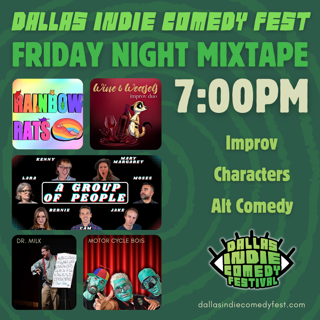 This show block features comedy acts by performers and teams from all across the nation. Enjoy Improv Comedy performances by Rainbow Rats (Dallas, TX), Wine & Weasels (San Francisco, CA), and A Group of People (Dallas, TX), a Character Monologue by Kent Wicklander (“Dr. Milk”, Dallas, TX), and an Alt Comedy experience by Motor Cycle Bois (Nashville, TN; Tulsa, OK).