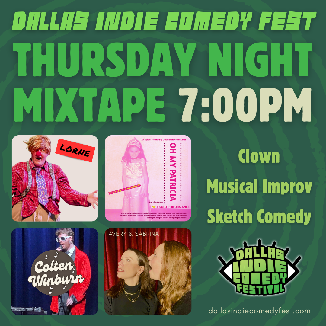 Dallas Indie Comedy Fest kicks off Opening Night with the DICF Thursday Night Mixtape at 7:00pm! Join us for a full hour of comedy, with Clown performances by Nan Kirkpatrick (“Lorne”, Dallas, TX) and Marceline Amaris (“Oh My Patricia!”, Austin, TX), a solo Musical Improv experience with Colten Winburn (Dallas, TX), and new Sketch Comedy by Avery & Sabrina (Dallas,TX).